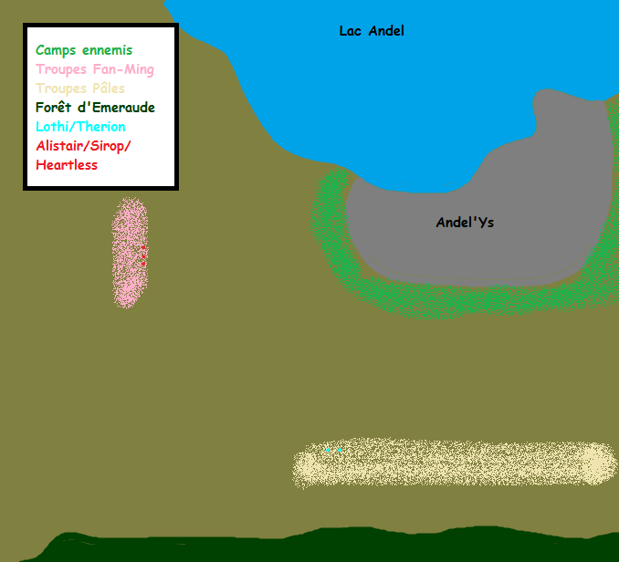 L'arrivée à Andel'Ys se fit de nuit, et de brouillard. Alistair était épuisé, mais l'adrénaline commençait à couler dans ses veines, éveillant ses sens embués et ses muscles endoloris. Ils s'arrêtèrent sur ordre du Capitaine une fois arrivés à bonne distance de la cité : assez loin pour ne pas être repérés par les troupes ennemies qui semblaient camper tout autour des murailles, mais assez prêt pour être à porté de vue des armées des Hommes Pâles, qui prenaient position devant la forêt d'où ils avaient émergés.