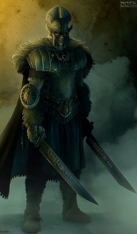 - Créatures noires : Larges comme trois hommes, et hautes comme deux, elles portaient des armures noires qu’on aurait dit indissociables de leur corps, lui-même étrangement formé, puisqu’on l’aurait dit constitué, ou maintenu, en tout cas, de fils épais reliant les membres. Pas d’yeux visibles, pas d bouche, ou d’organe commun chez les êtres vivants. Ils étaient cependant bipèdes, et leurs mains énormes étaient des armes qu’il ne valait mieux pas rencontrer. Des bêtes créées pour la guerre. Pour tuer… Massacrer sans le moindre discernement.