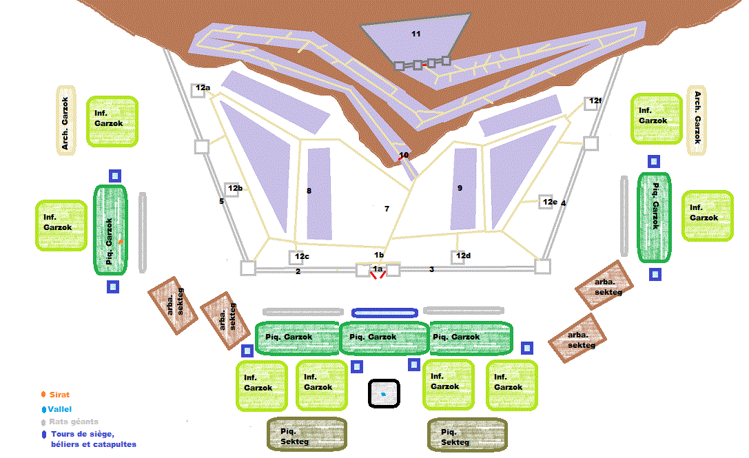 Éparpillés équitablement partout, les trente scorpions de siège s’apprêtaient à faire pleuvoir des lances meurtrières sur les chemins de garde. Sept par pan de muraille, et une sur les pans les plus extérieurs, qui n’étaient que faiblement menacés par des archers garzoks et de l’infanterie de réserve. Les arbalétriers se massaient aux coins des murailles, prêts à s’intercaler derrière les assaillants pour couvrir les grimpeurs lorsque les défenseurs tenteraient de les déloger de leurs échelles nombreuses.