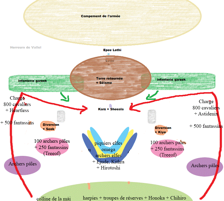 Ce massacre perpétré, ils reformèrent la ligne car déjà, la menace des garzoks se fit sentir. Ils arrivaient, et il leur faudrait faire face. Les deux charges majeures et les troupes elfes et ynoriennes contre les garzoks, et les cavaleries de diversion et les archers et infanteries pâles contre les horreurs de Vallel, horribles et menaçantes. Plus la menace, omniprésente, de ce séisme incontrôlable qui flirtait déjà avec Karz, posé non loin de la Reine Pâle.