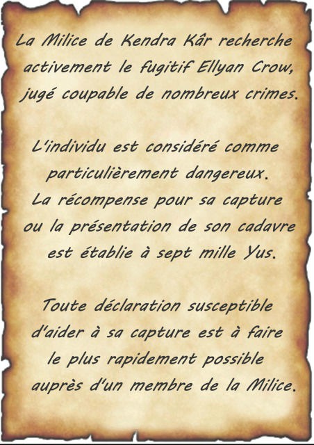 "Je... Bouge pas de là."Sur ces mots, il disparaît en pressant le pas jusqu'à s'engouffrer derrière la draperie. J'entends le bruit d'un loquet qui claque, le grincement d'une porte qui s'ouvre et se referme, puis plus rien. Alors je patiente, bercé par le succès d'avoir joué de ma mauvaise réputation. Ragaillardi, je me remémore mes anciens plans qui datent de mon évasion des geôles de la cité. J'étais fou de me penser capable de réduire Kendra-Kâr en cendres, mais ce rêve ne m'en paraît plus un depuis mon entrée chez les Murènes. J'ai le matériel qu'il me faut, la sécurité dont j'ai besoin et personne ne trouve à redire sur la qualité de mon travail. Mon petit moment d'euphorie s'envole définitivement lorsque le garde revient, les mains vides de mon avis de recherche. J'en conclus qu'il a été adressé à sa hiérarchie et me garde donc de le lui réclamer.