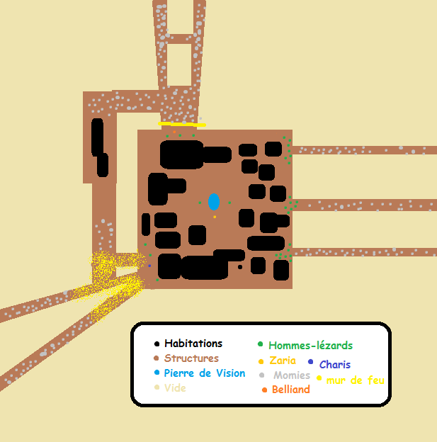 La lumière persiste, jusqu’à ce que mes yeux s’habituent à la lumière et je me rends compte qu’elle éclaire toute la salle dans laquelle je me trouve, illuminant les moindres recoins d’ombre comme si elle refoulait les ténèbres. Du coin de l’œil, j’avise des créatures autour de nous qui tombent, comme soudainement dépourvues du souffle qui jusque-là les tenait encore debout. Toutes ? Non, l’une d’elle résiste encore et toujours : mon opposant. Ce dernier claudique et tente de me porter un nouveau coup, mais c’était sans compter sur les deux confrères lézards qui sont vaillamment restés à mes côtés. Ils s’avancent pour abattre leurs longues lances sur la momie jusqu’à ce qu’il s’effrite lentement sur lui-même, ne devenant qu’un tas d’os et de bandelettes. Je reste quelques brefs instants à regarder ses restes, les yeux écarquillés, le souffle court. Je peine à comprendre ce qu’il s’est passé, mais je me retourne vers les deux hommes-lézards avec un sourire, pour leur dire :