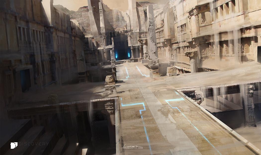 Derrière la porte, Aliéron put découvrir de grandes ruines qui, étrangement, ne semblaient en aucun cas pouvoir se trouver sous une cité. Sur les côtés, il n'y avait qu'un vide d'apparence sans fond, et face à lui, un chemin qui menait vers un embranchement. Il y avait trois entrées, mais la principale semblait être celle de face.